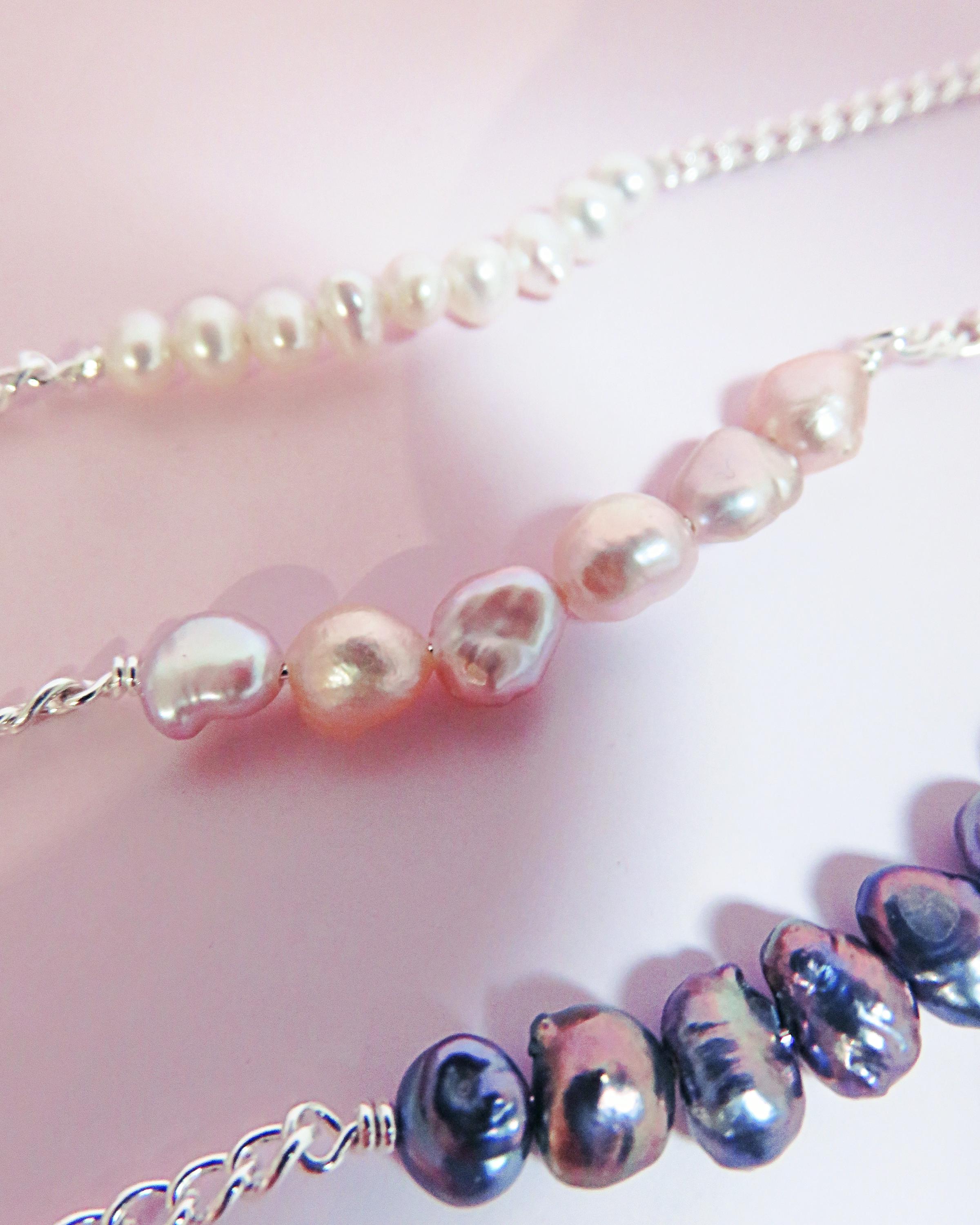 - Pierre : perles eau douce: blanches et roses: naturelles / noires: naturelles teintées.