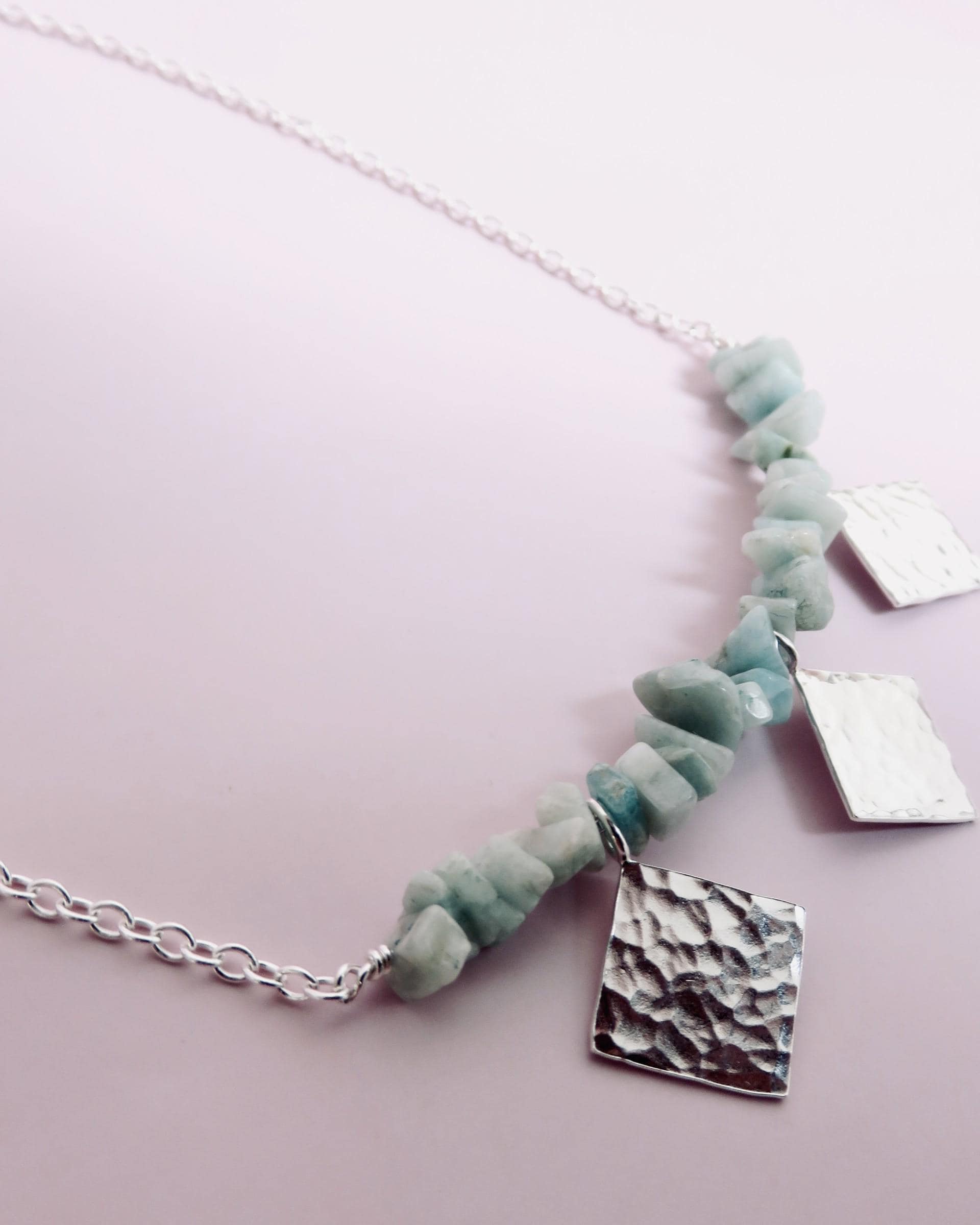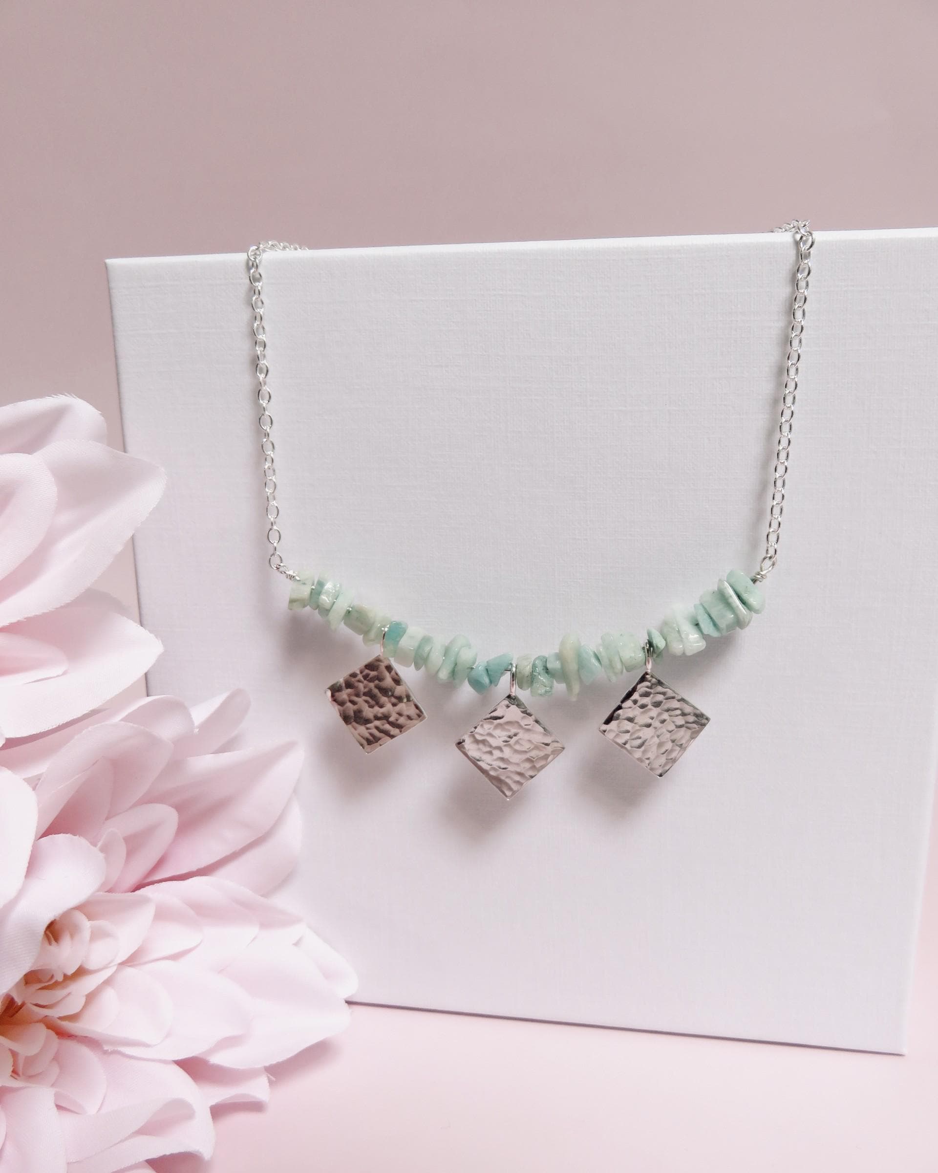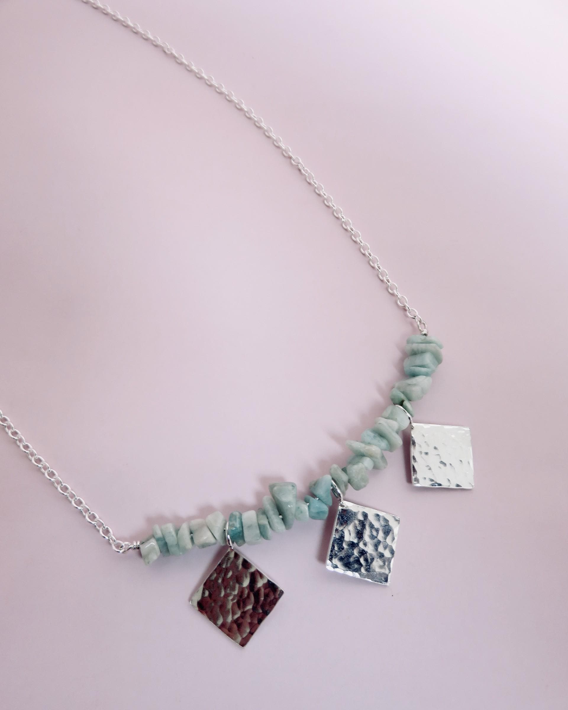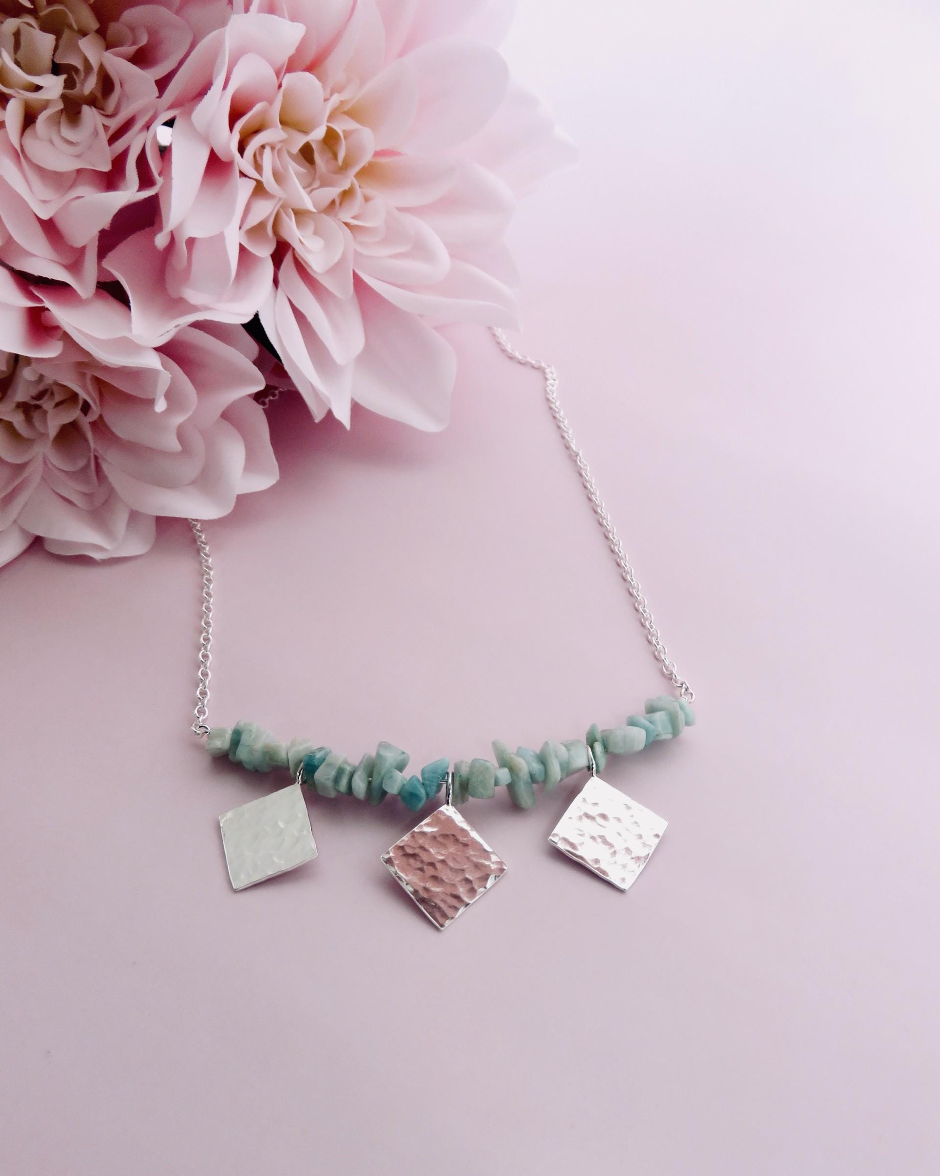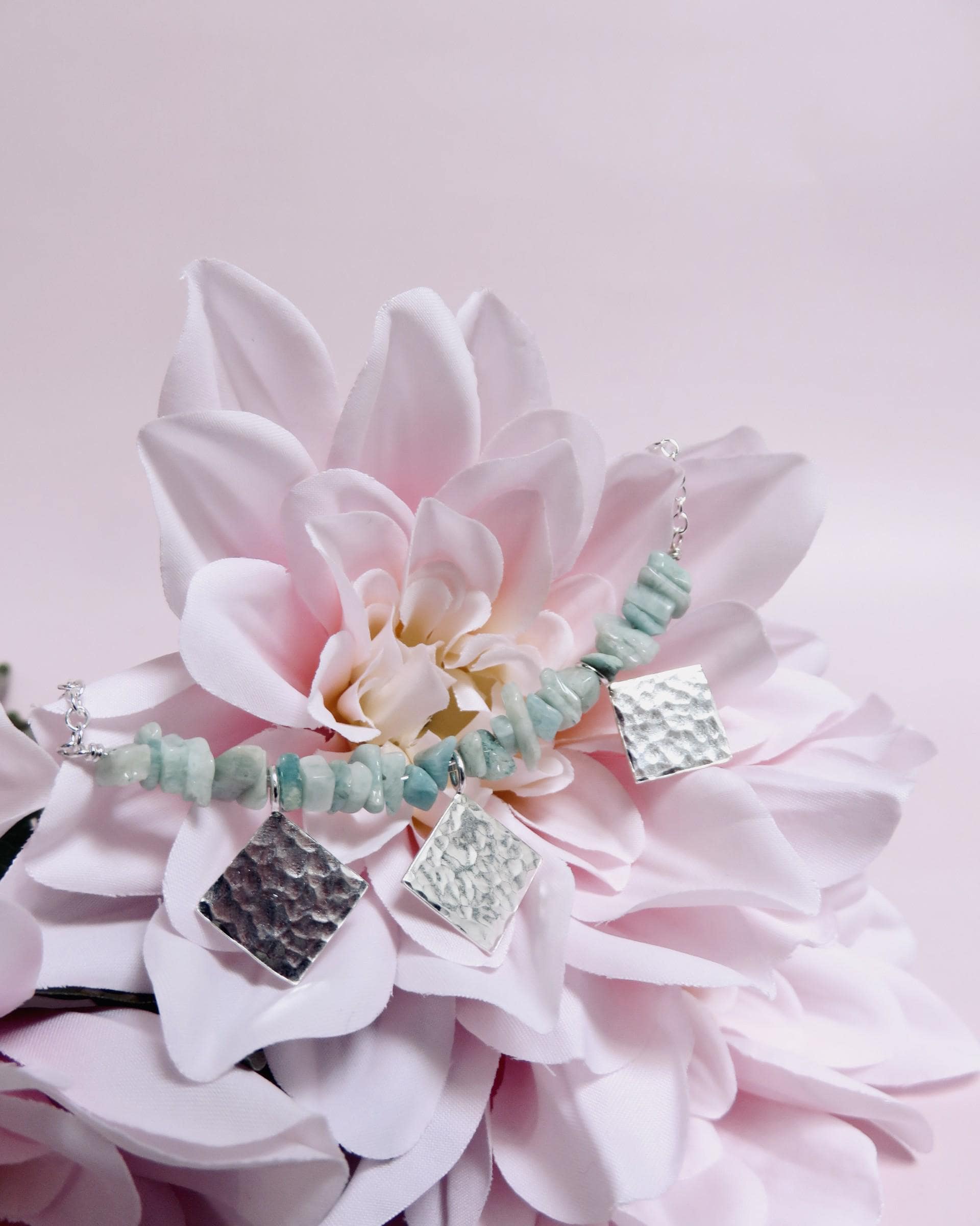 Il allie la douceur apaisante de l’amazonite à la brillance éclatante de l’argent martelé, pour un rendu à la fois lumineux et équilibré.