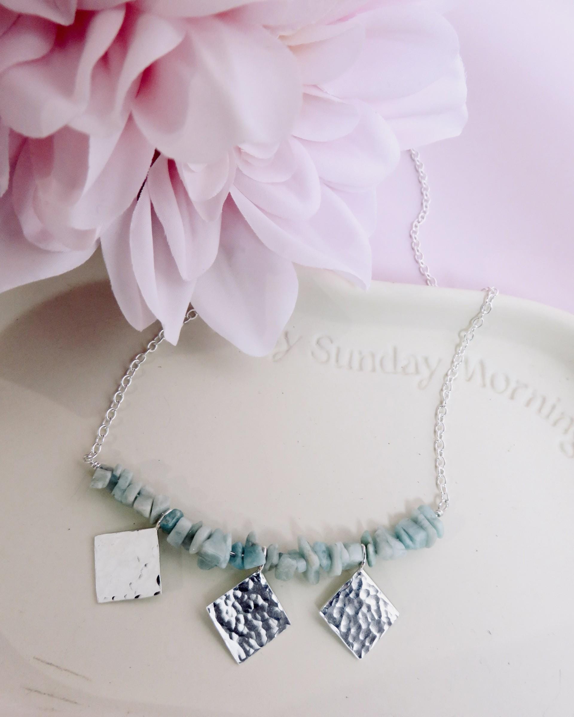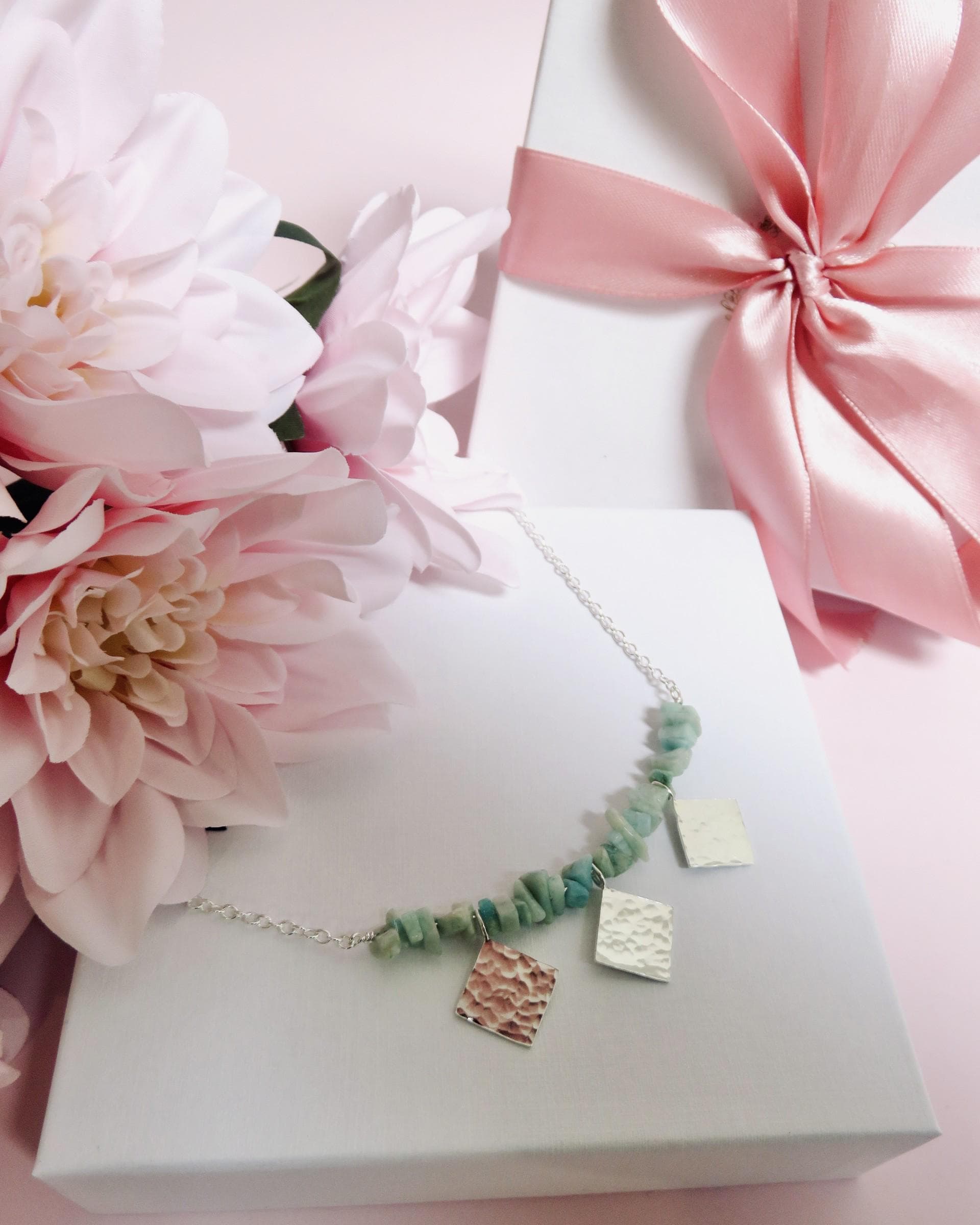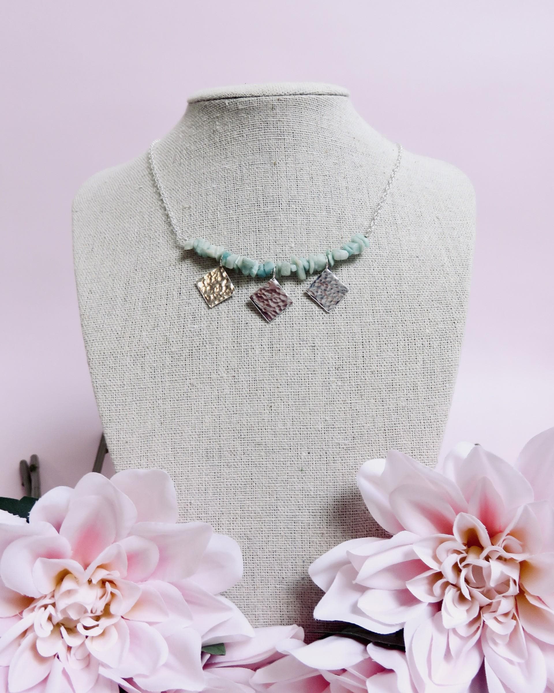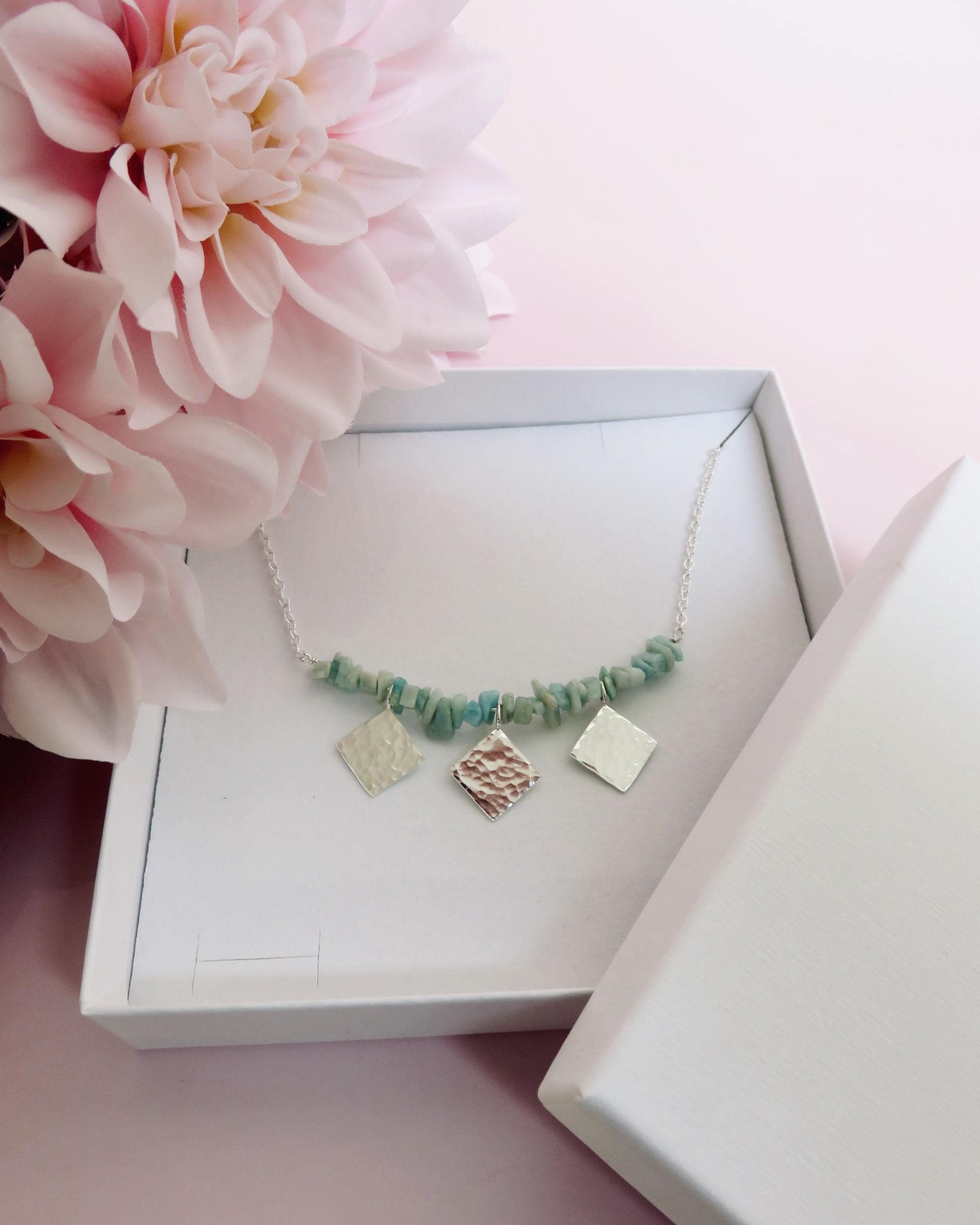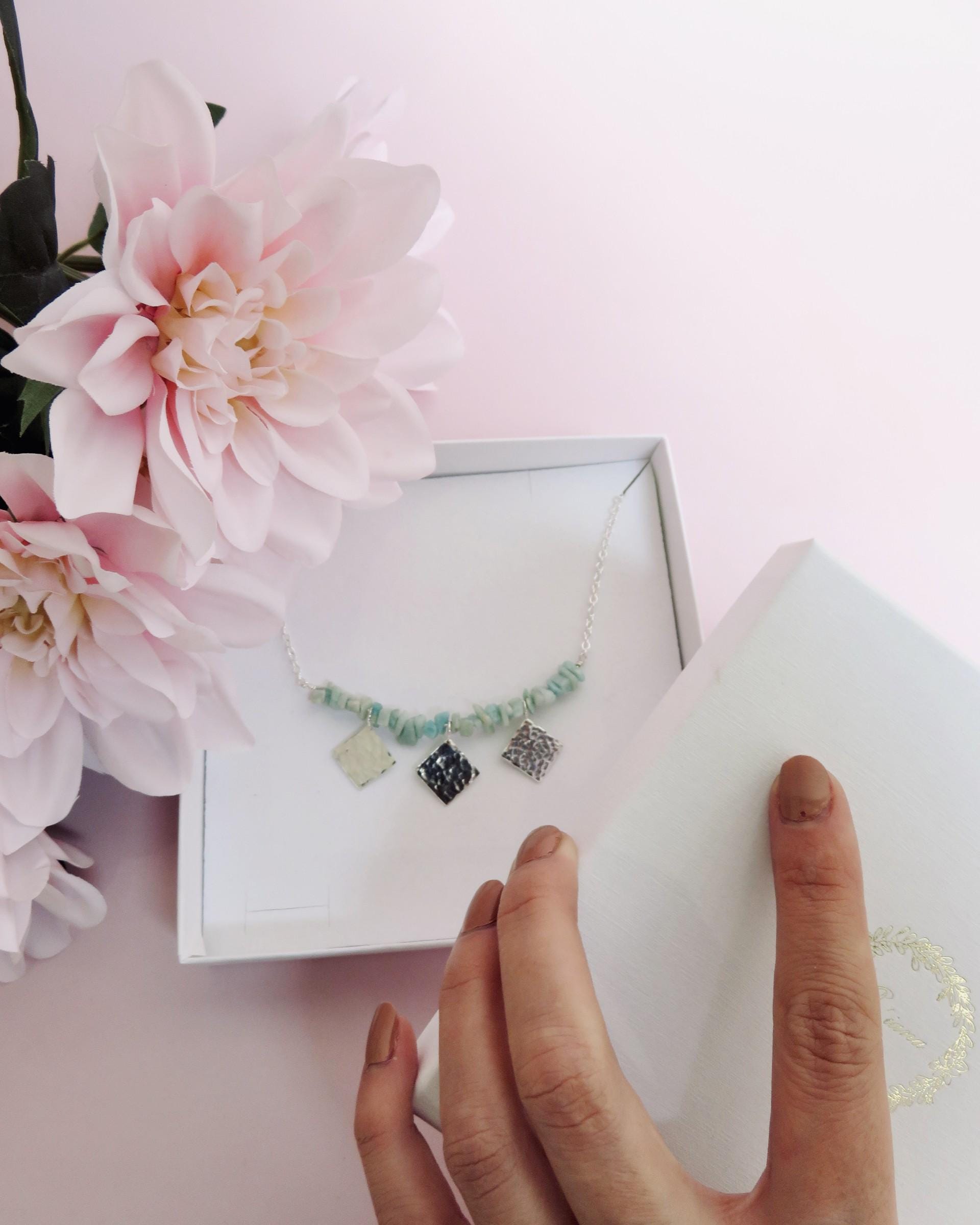 Il allie la douceur apaisante de l’amazonite à la brillance éclatante de l’argent martelé, pour un rendu à la fois lumineux et équilibré.
