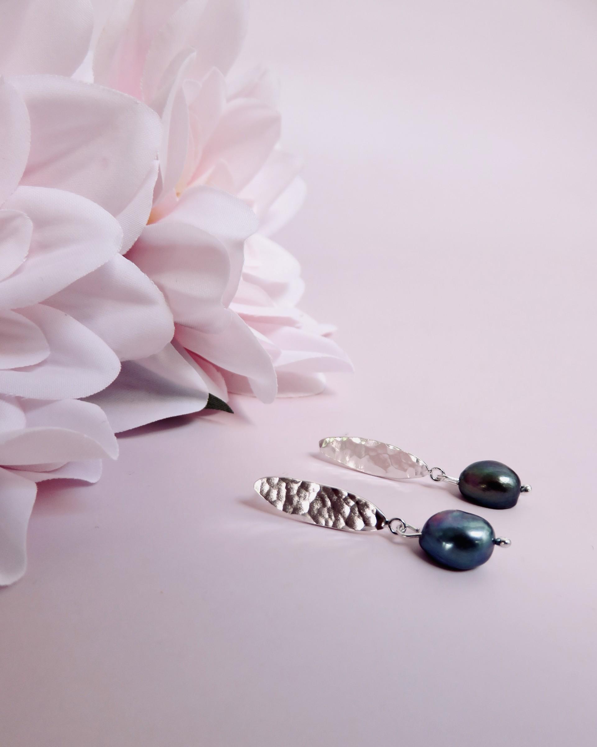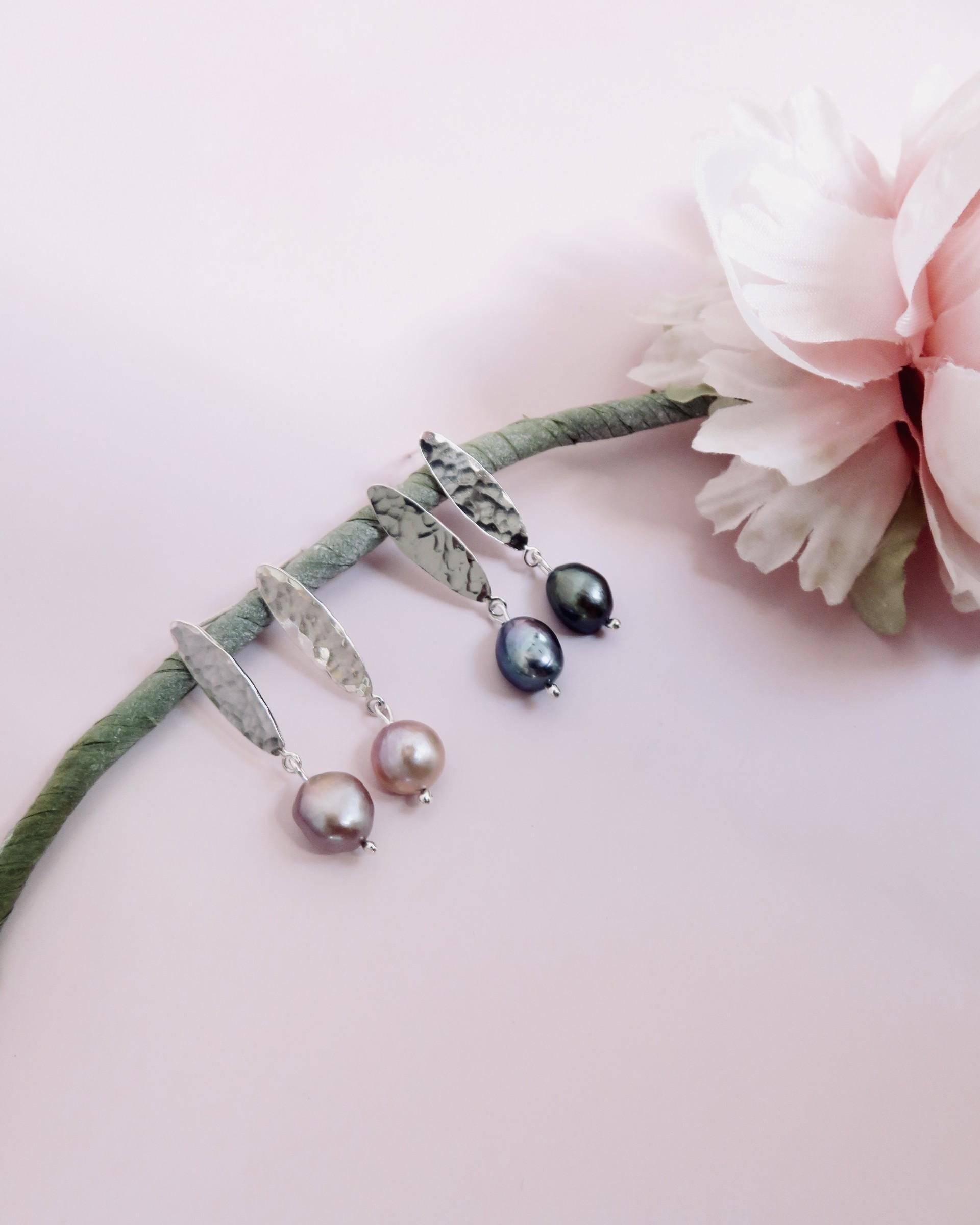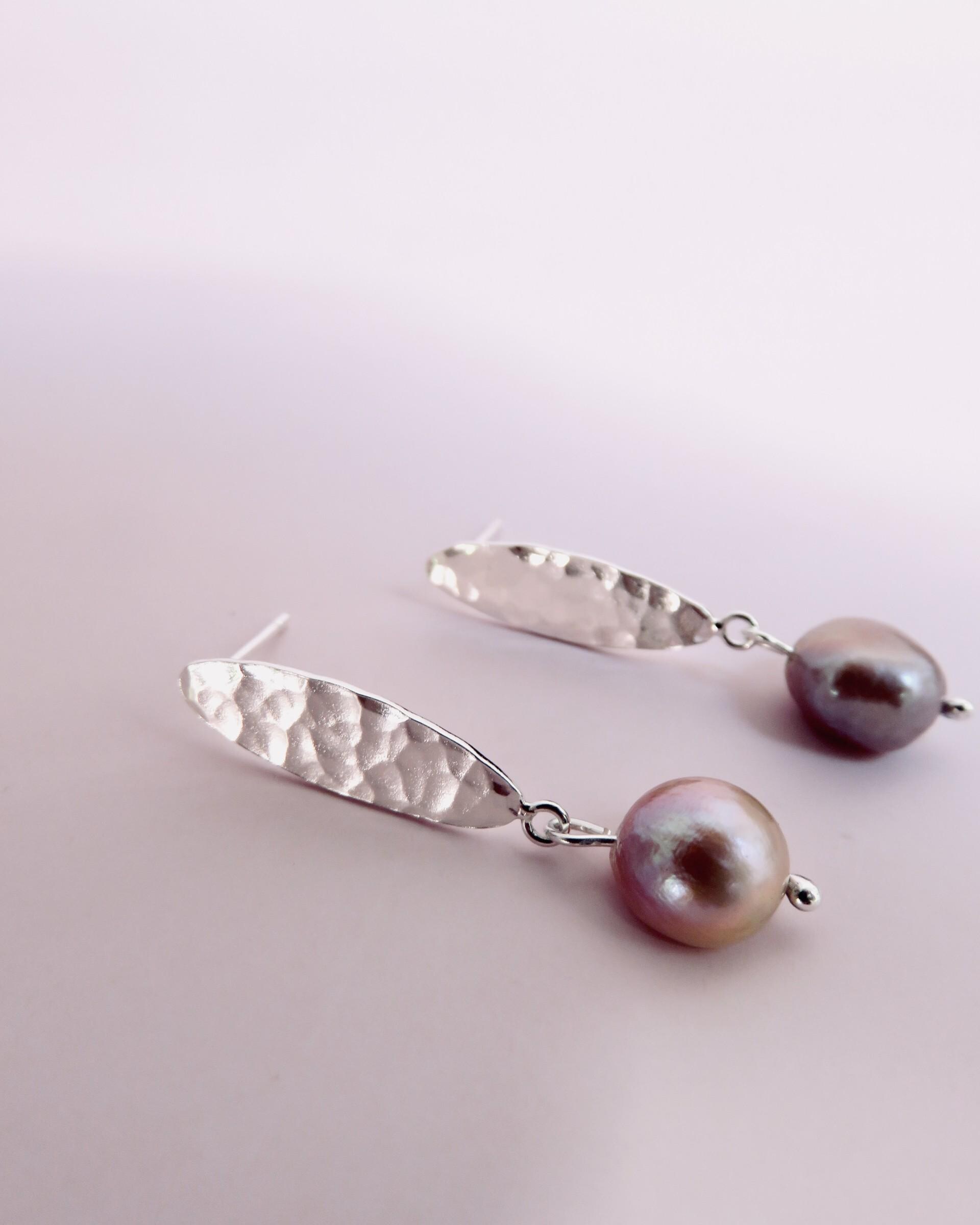 Les boucles d’oreilles Ann allient sobriété et éclat. Leur partie supérieure, en argent 925 martelé à la main, reflète délicatement la lumière. Chaque paire est ornée d’une perle d’eau douce naturelle, choisie pour ses reflets uniques — rose poudré ou noir profond.