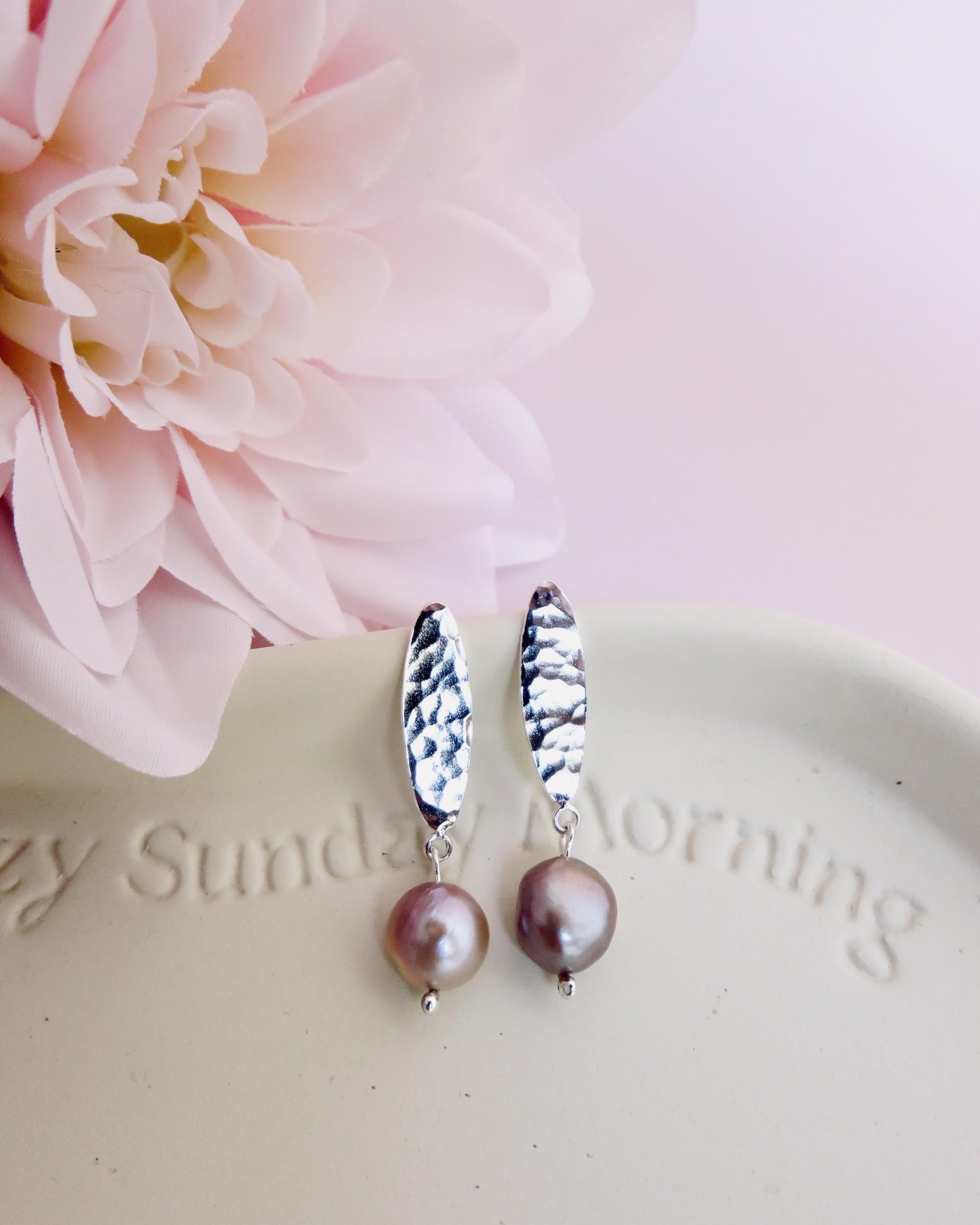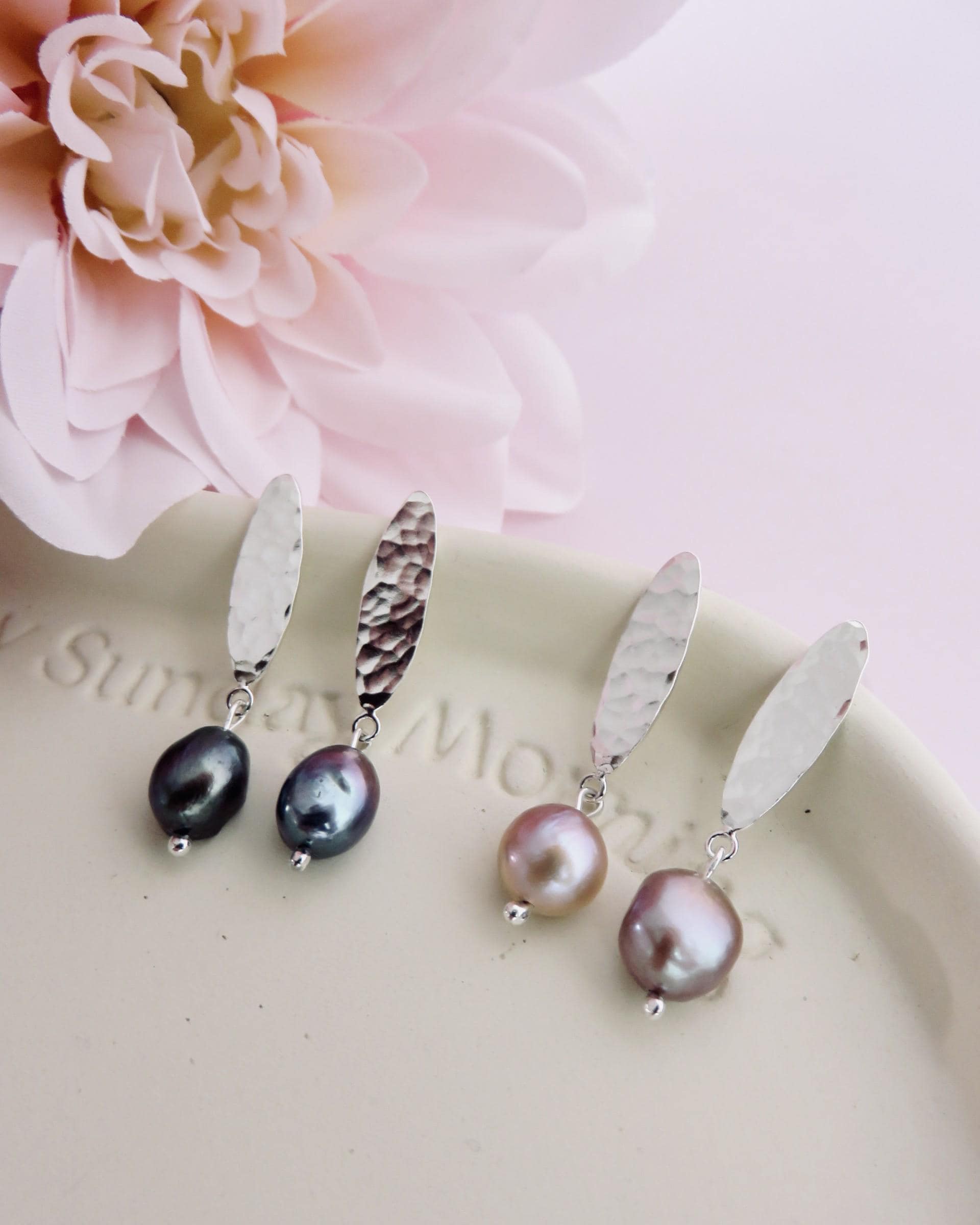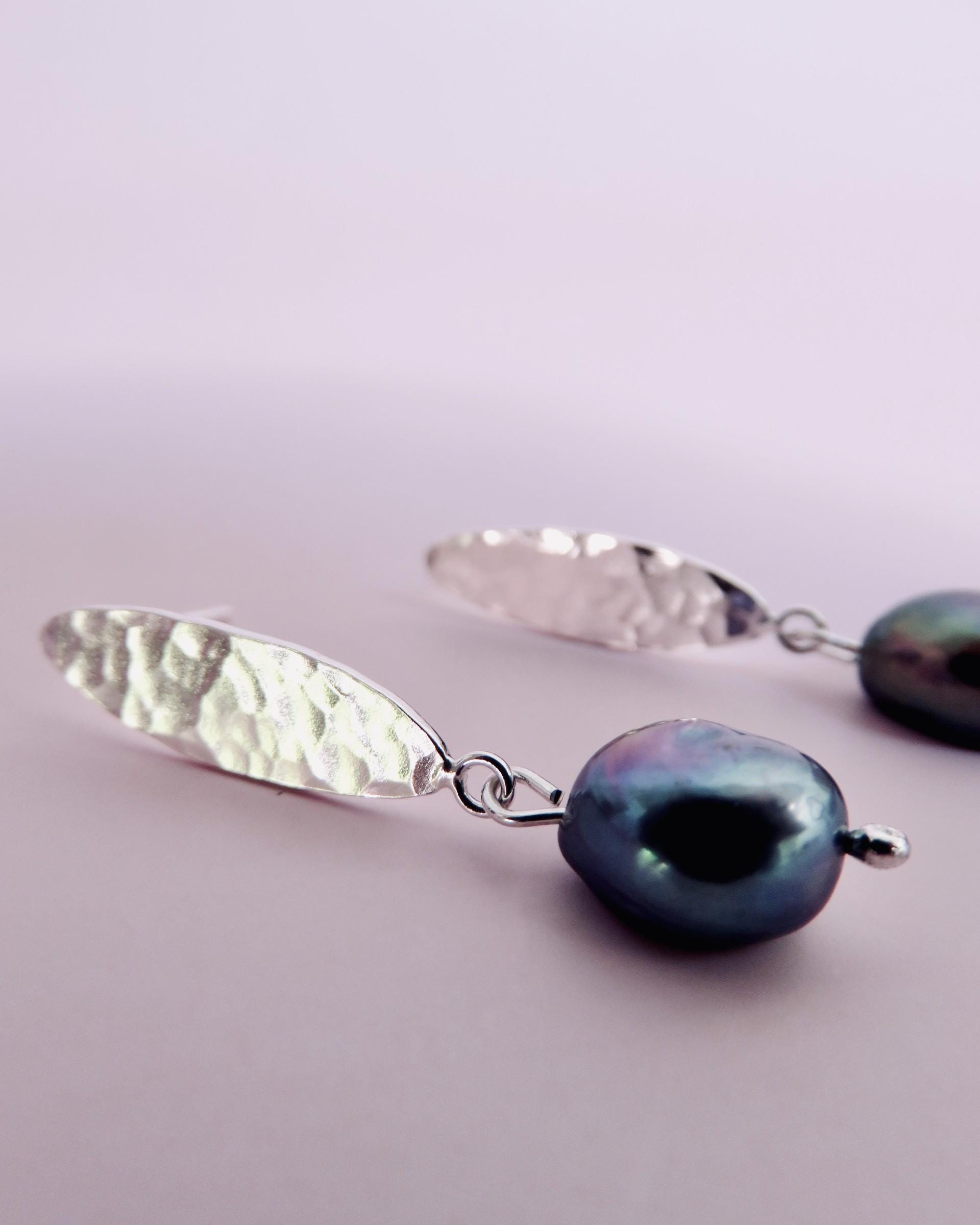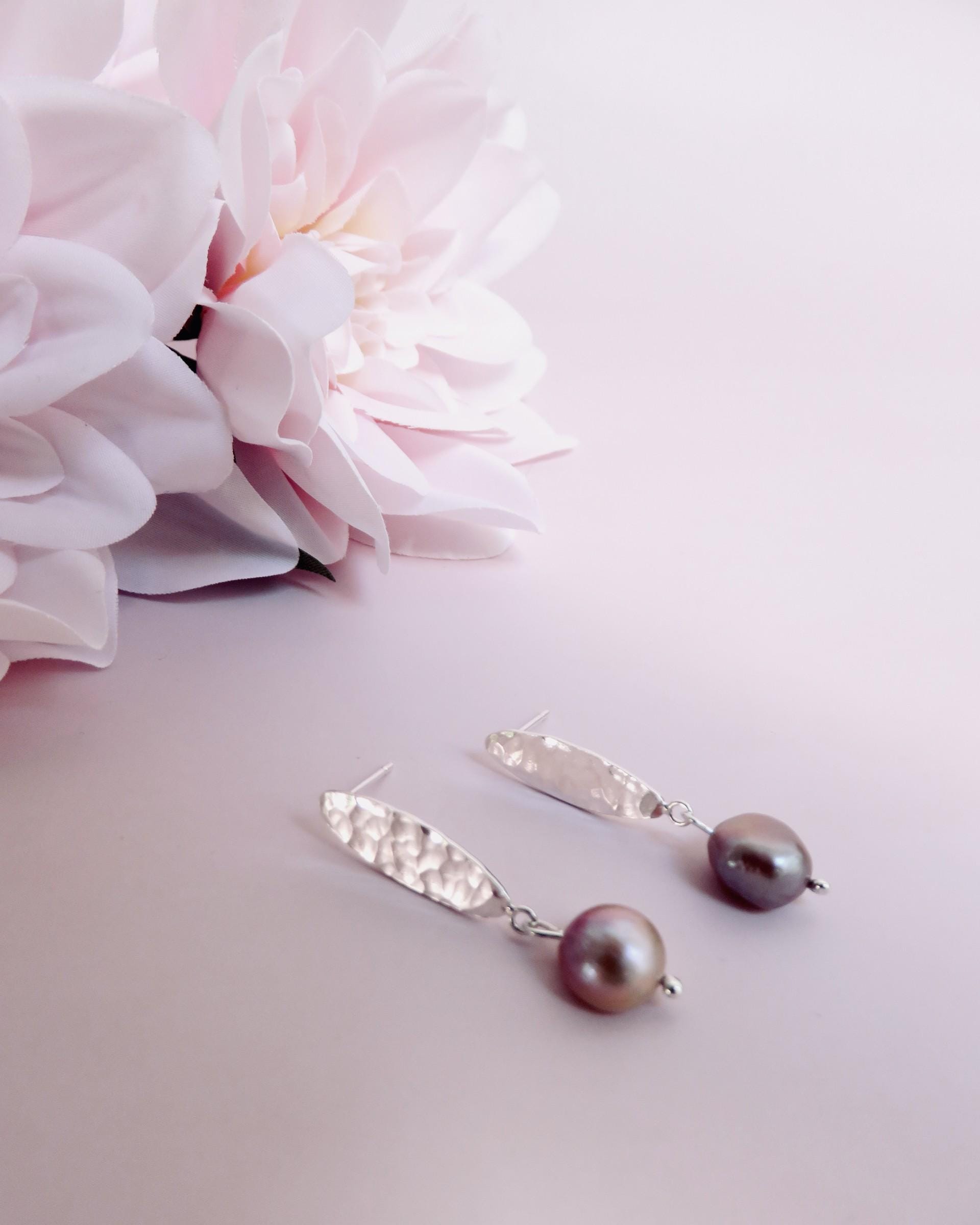 Les boucles d’oreilles Ann allient sobriété et éclat. Leur partie supérieure, en argent 925 martelé à la main, reflète délicatement la lumière. Chaque paire est ornée d’une perle d’eau douce naturelle, choisie pour ses reflets uniques — rose poudré ou noir profond.