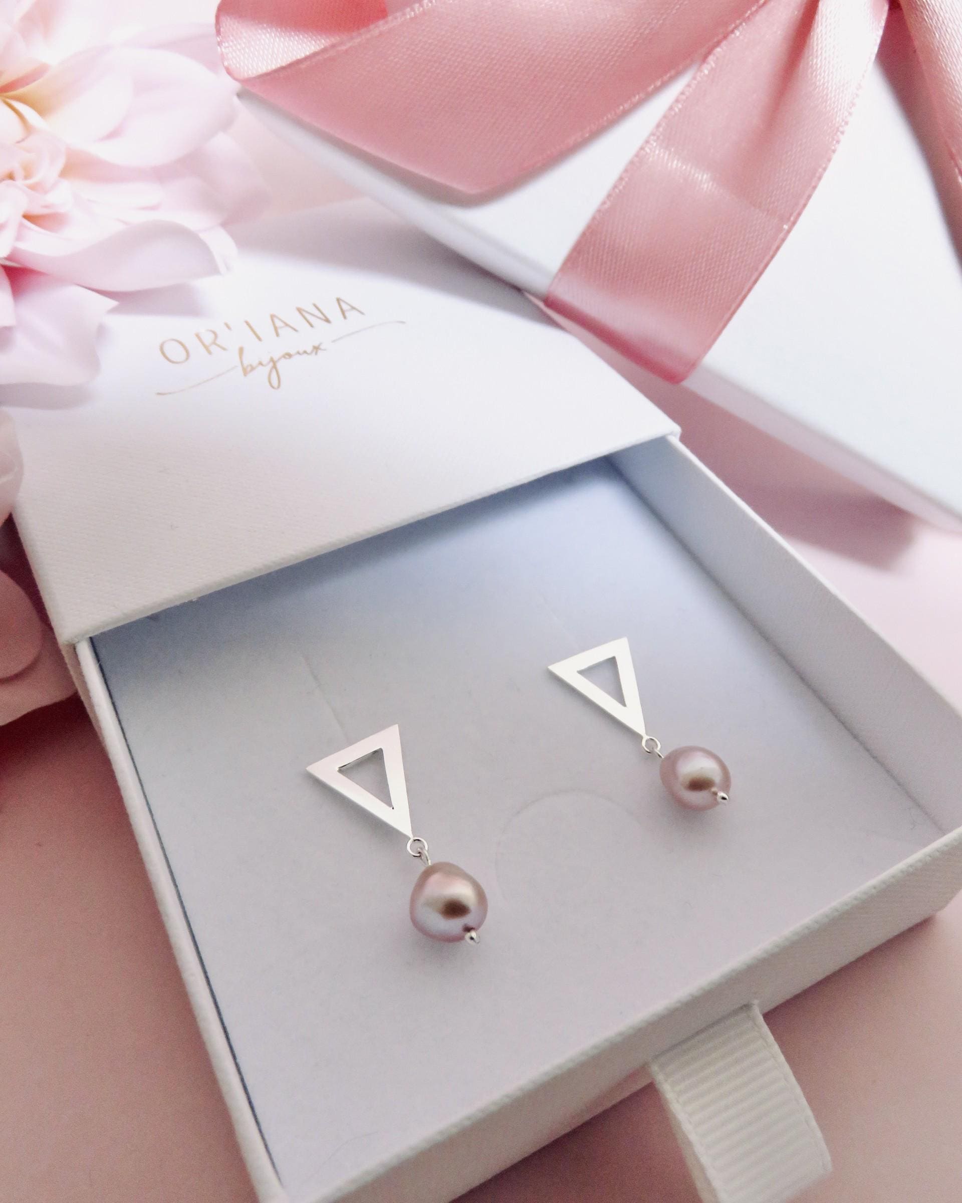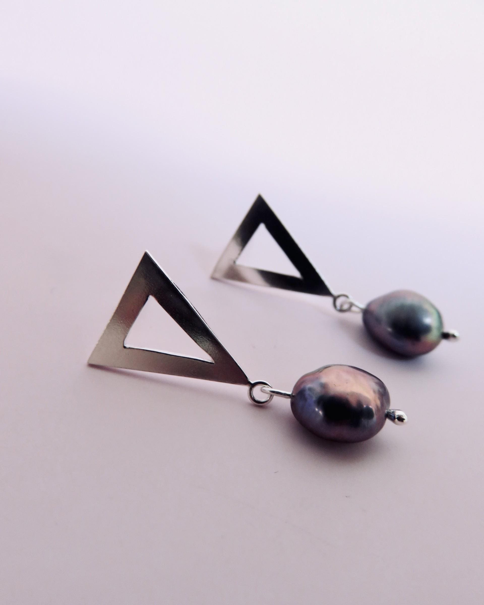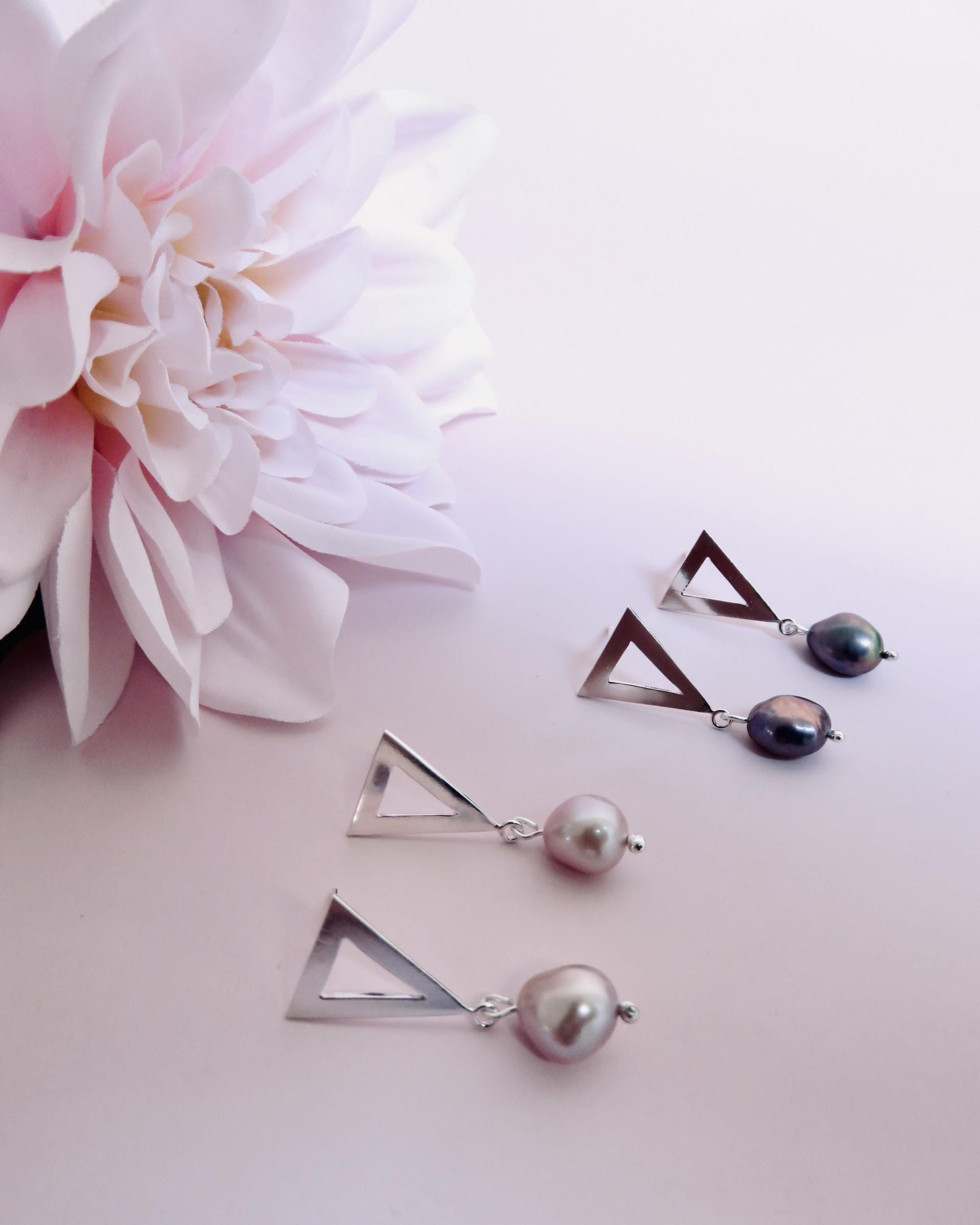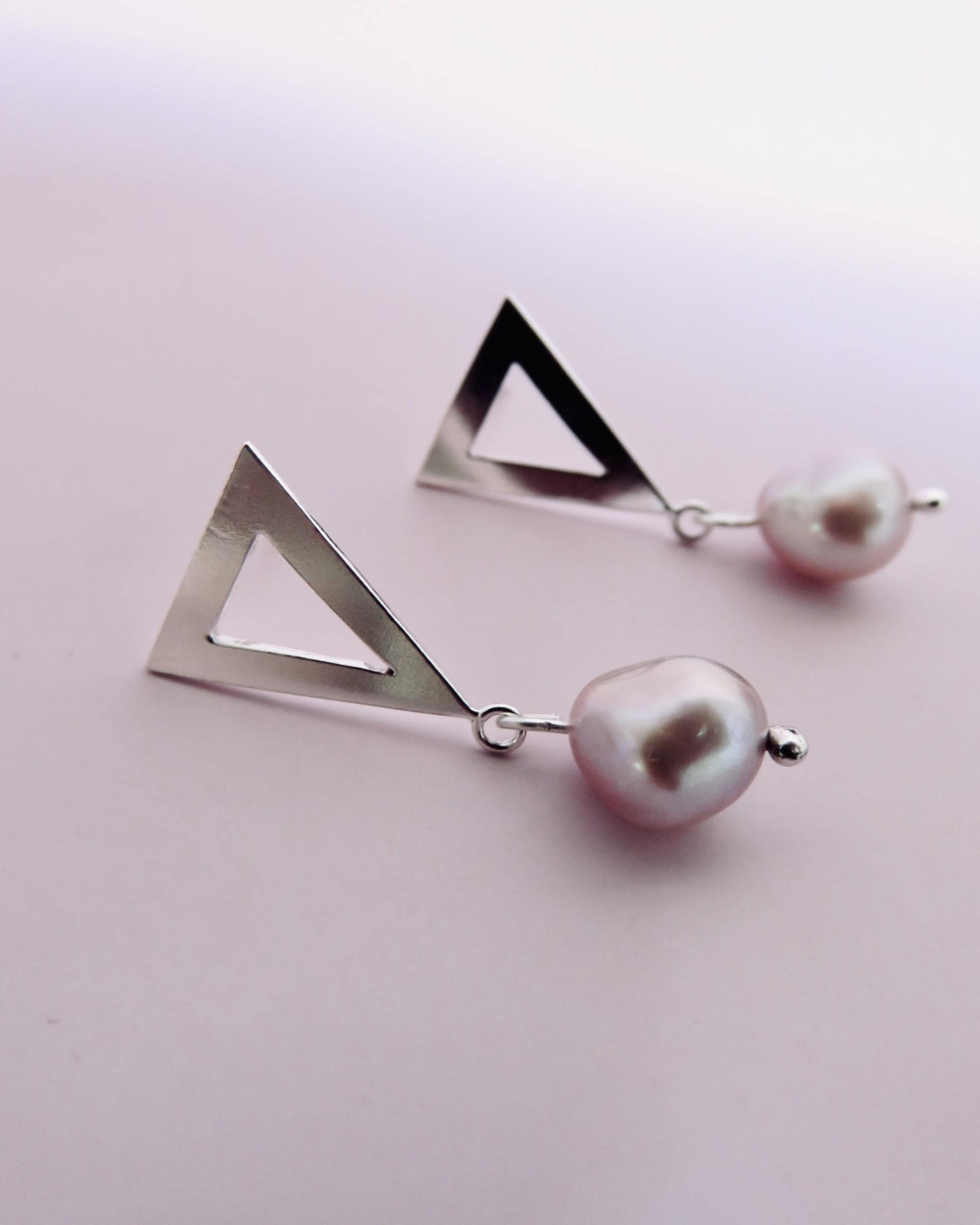Leur triangle en argent 925, découpé avec précision, crée un jeu graphique et contemporain, tandis que la perle d’eau douce vient adoucir l’ensemble de ses reflets changeants.