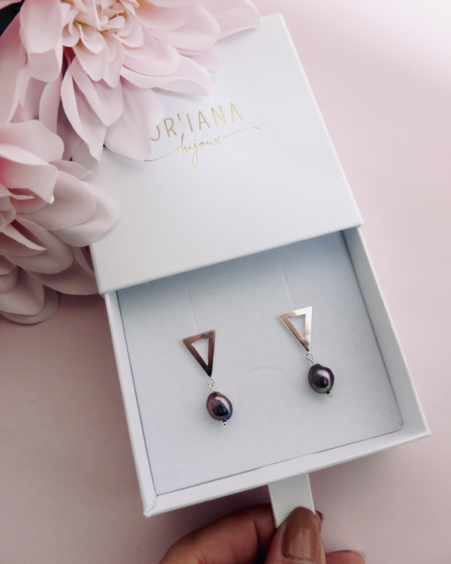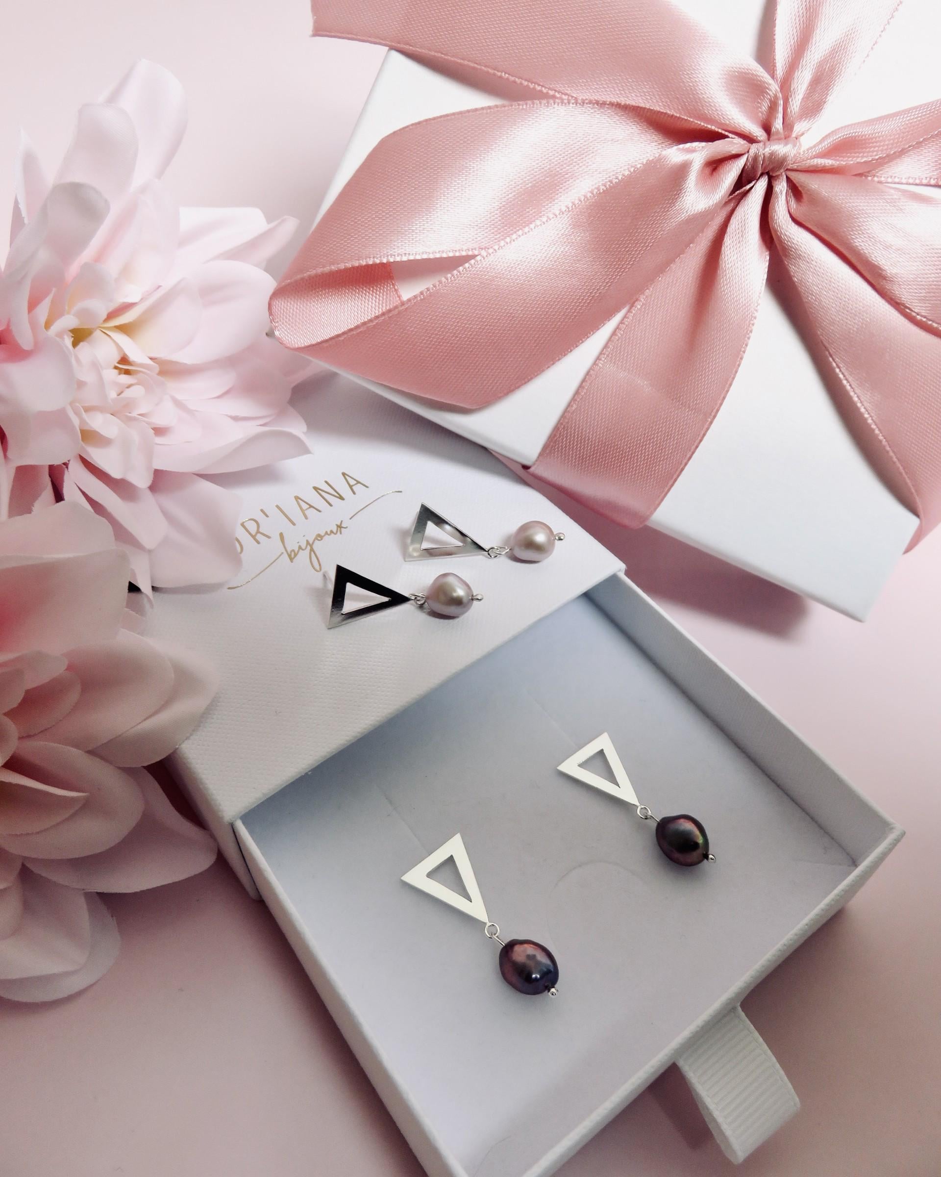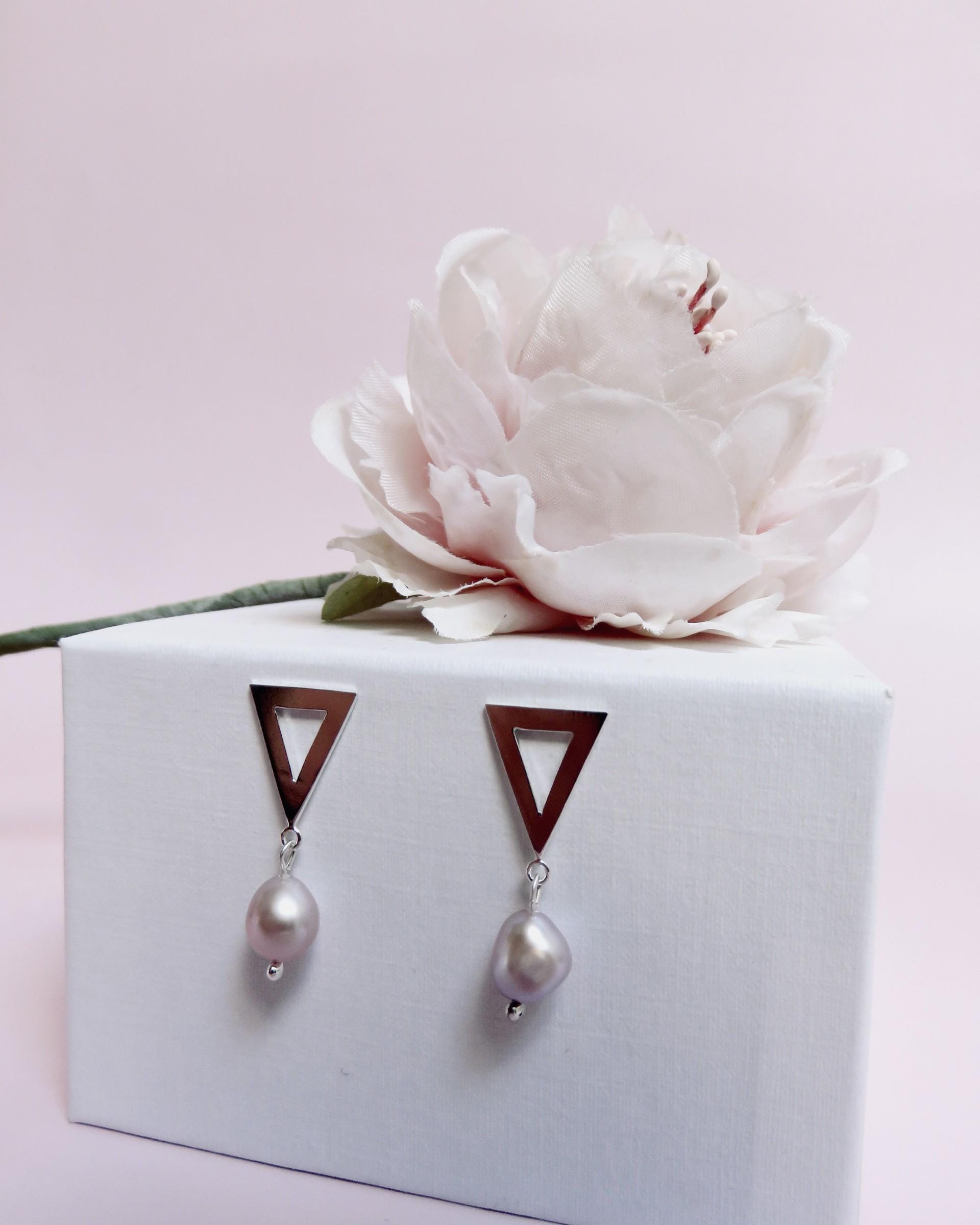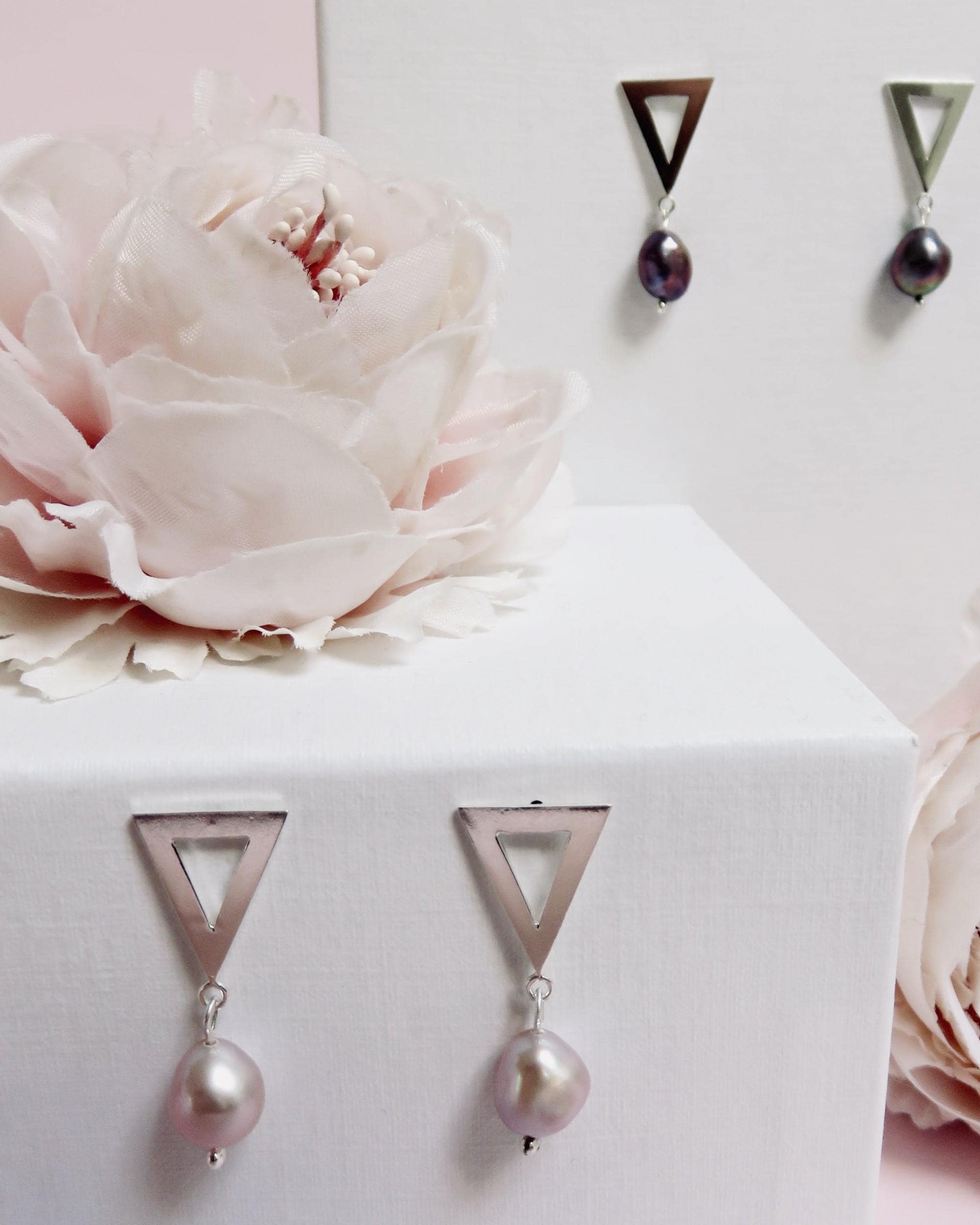 Leur triangle en argent 925, découpé avec précision, crée un jeu graphique et contemporain, tandis que la perle d’eau douce vient adoucir l’ensemble de ses reflets changeants.
