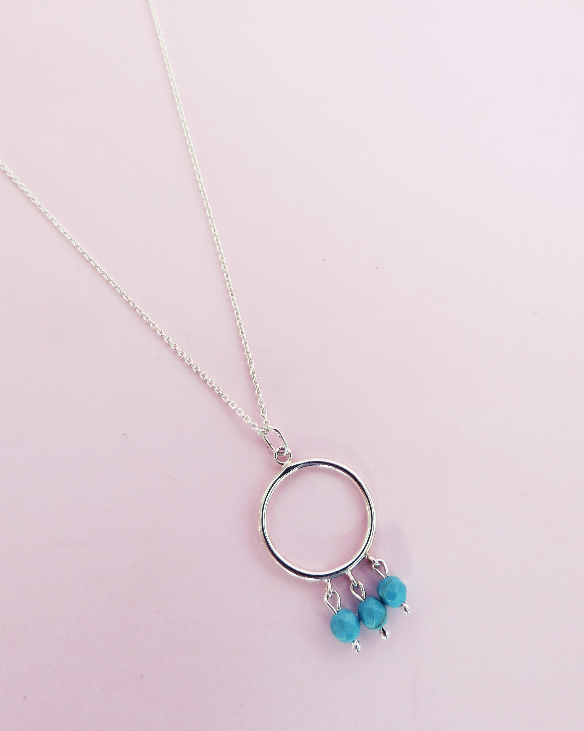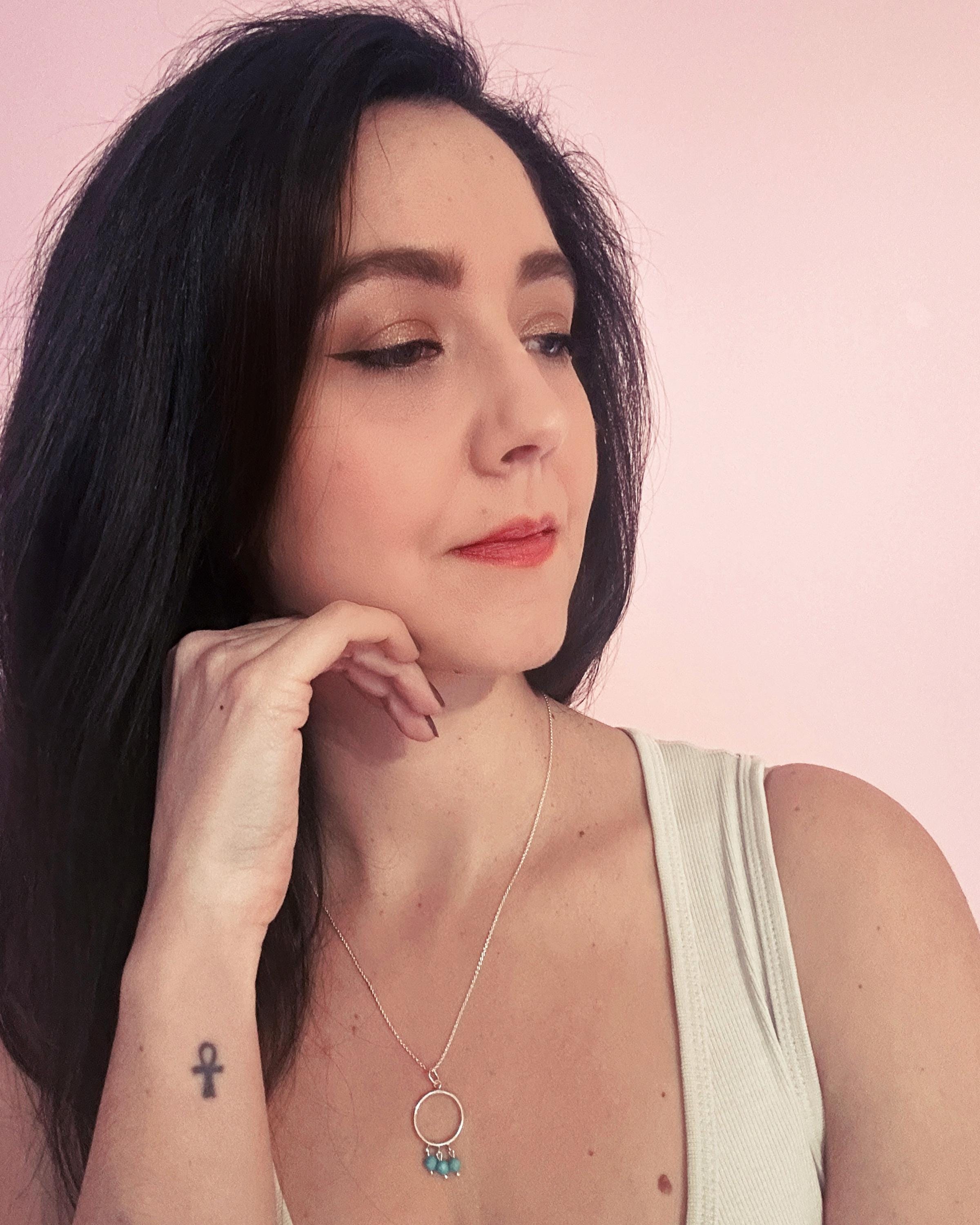 Son anneau en argent 925 forme un cercle épuré, symbole d’unité et d’éternité. Trois perles en howlite teintée, aux nuances turquoise lumineuses, viennent délicatement danser sous le cercle. Leur couleur évoque les pierres anciennes utilisées dans les parures égyptiennes, tout en apportant une touche fraîche et pétillante.