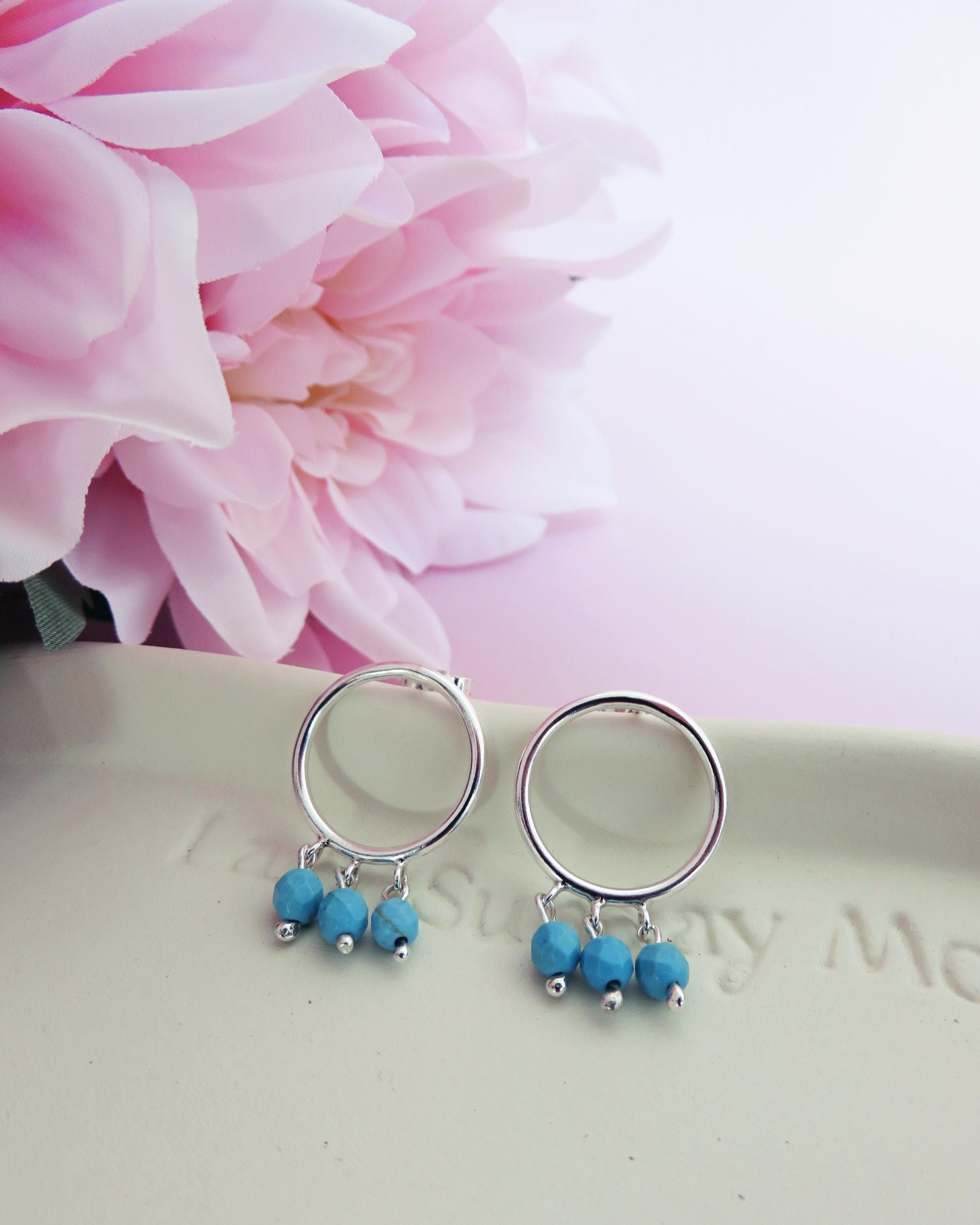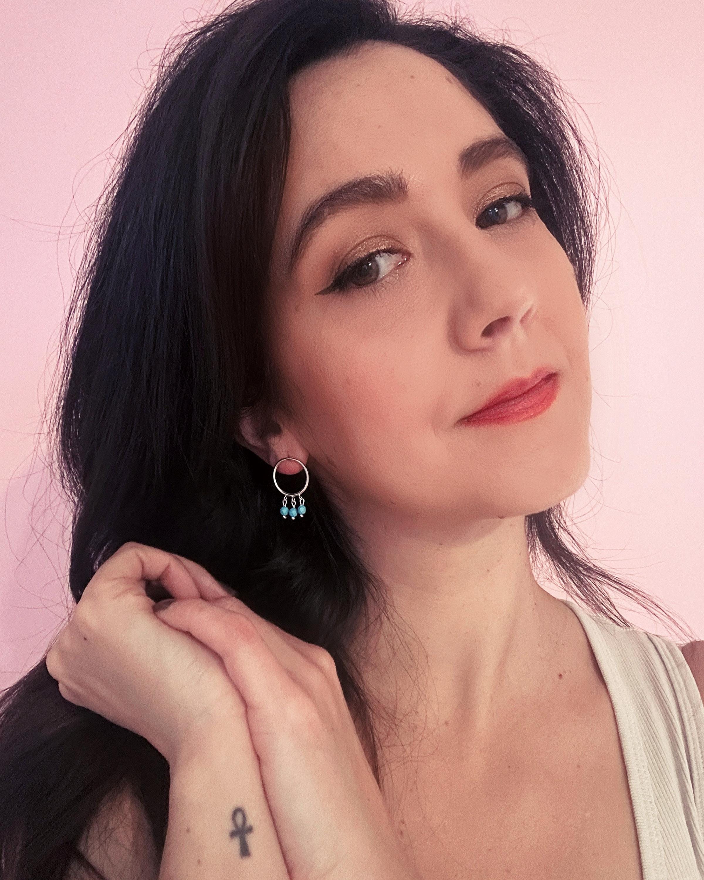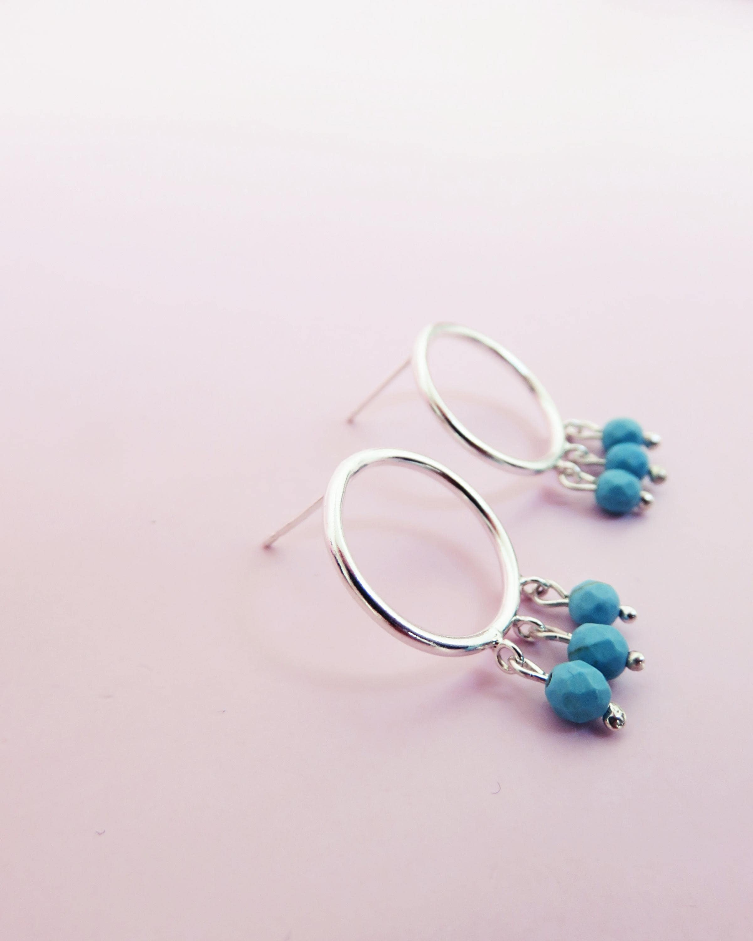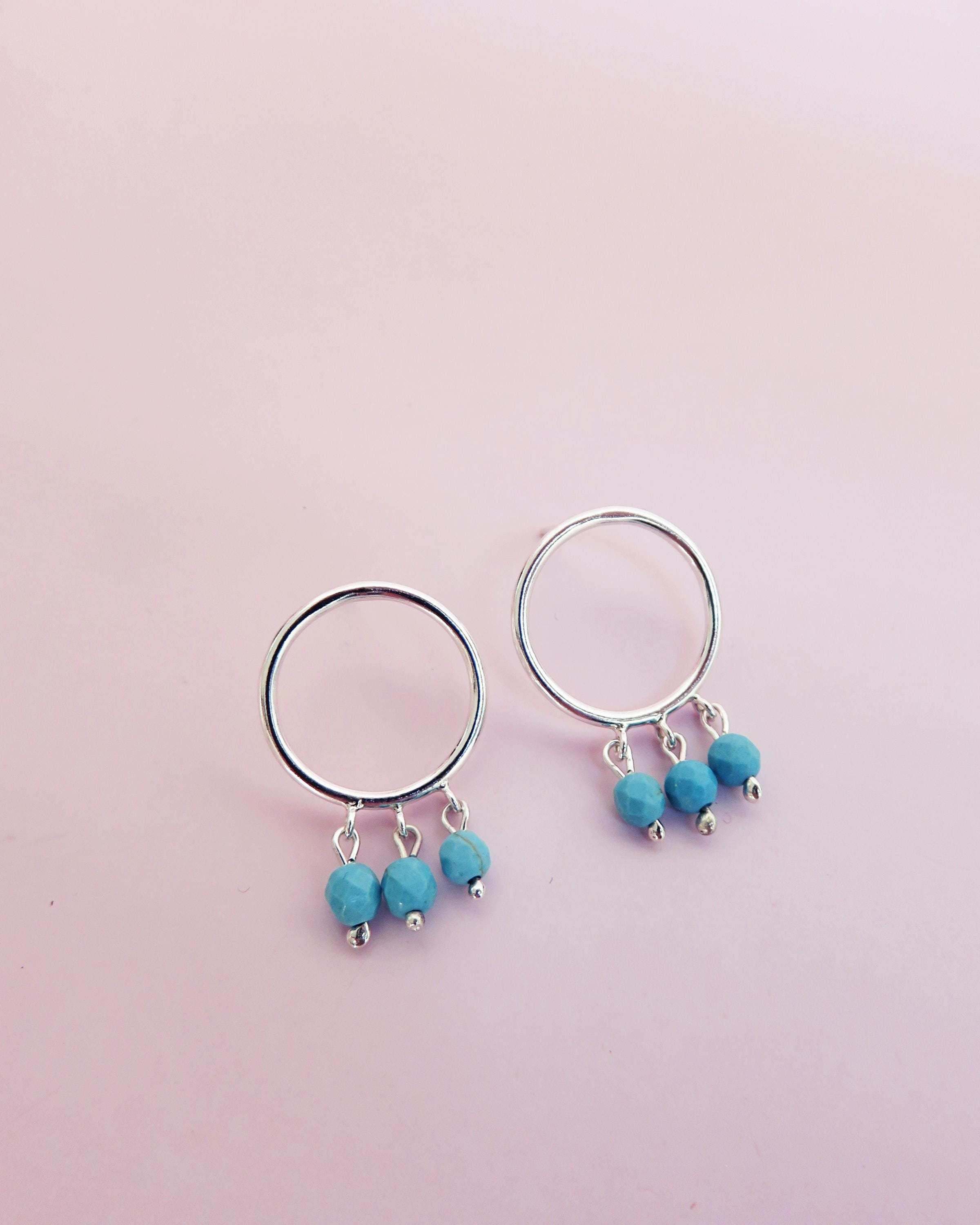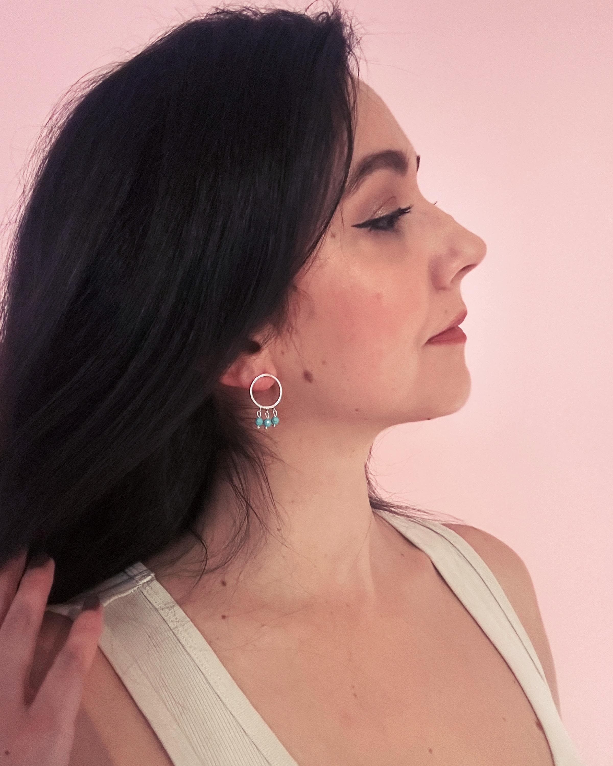 Chaque anneau en argent 925 accueille trois éclats turquoise disposés en mouvement, comme une vibration légère au creux du métal. La pierre apporte une touche lumineuse et vivante, en contraste avec la sobriété de la ligne.